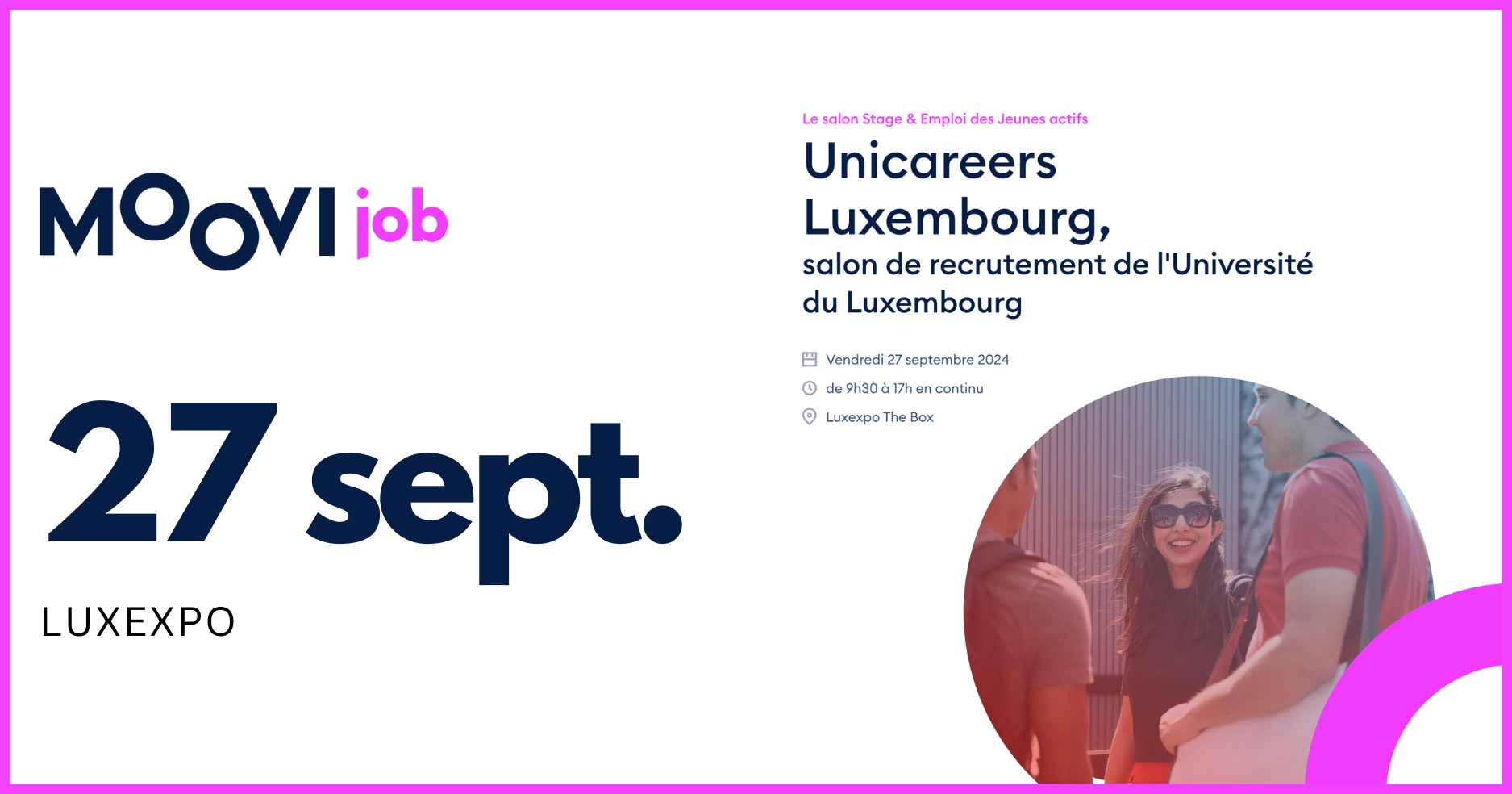 Nous vous donnons rendez-vous au salon Unicareers Luxembourg, qui se tiendra le vendredi 27 septembre 2024 de 9h30 à 17h en continu, à Luxexpo The Box.